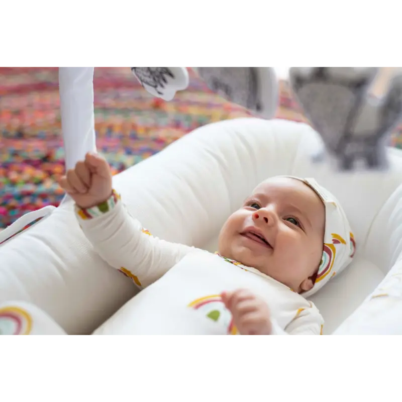 DockAtot® is ontworpen om een veilige, knusse en rustgevende omgeving voor baby’s  te bieden. We willen graag denken dat deze nestjes het beste alternatief zijn voor de baarmoeder. Baby’s kunnen rusten, spelen en een loungen, zonder de beperkingen van gespen of de afleiding van felgekleurde toeters en bellen.